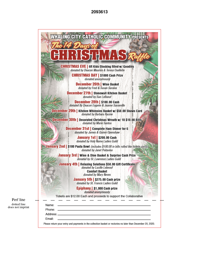 $12.00 each or 2 for $20.00 Tickets will be sold after masses ( weekday and weekend ) or at our rectories ( Holy Name & St. Lawrence ) during business hours (call first)