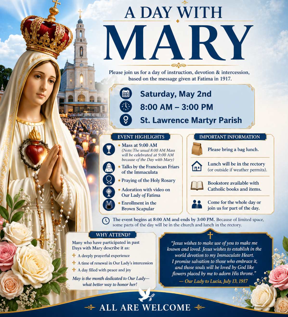 A Day with Mary – May 2nd Apr 27, 2026 Join us for a day of instruction, devotion, and intercession – based on the message given at Fatima in 1917. Saturday, May 2nd at 8:00am St. Lawrence Martyr Church 565 County St., New Bedford, MA