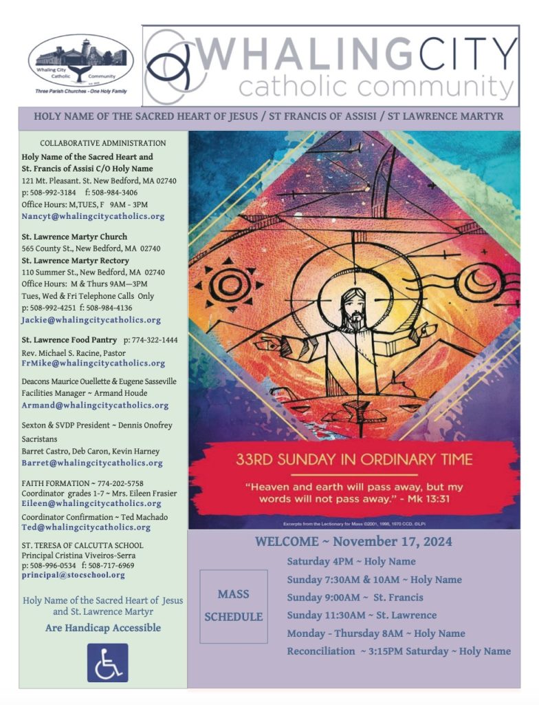 Bulletin for 33rd Sunday in Ordinary Time November 17, 2024 Nov 14, 2024 To view Bulletin select image above or this link.