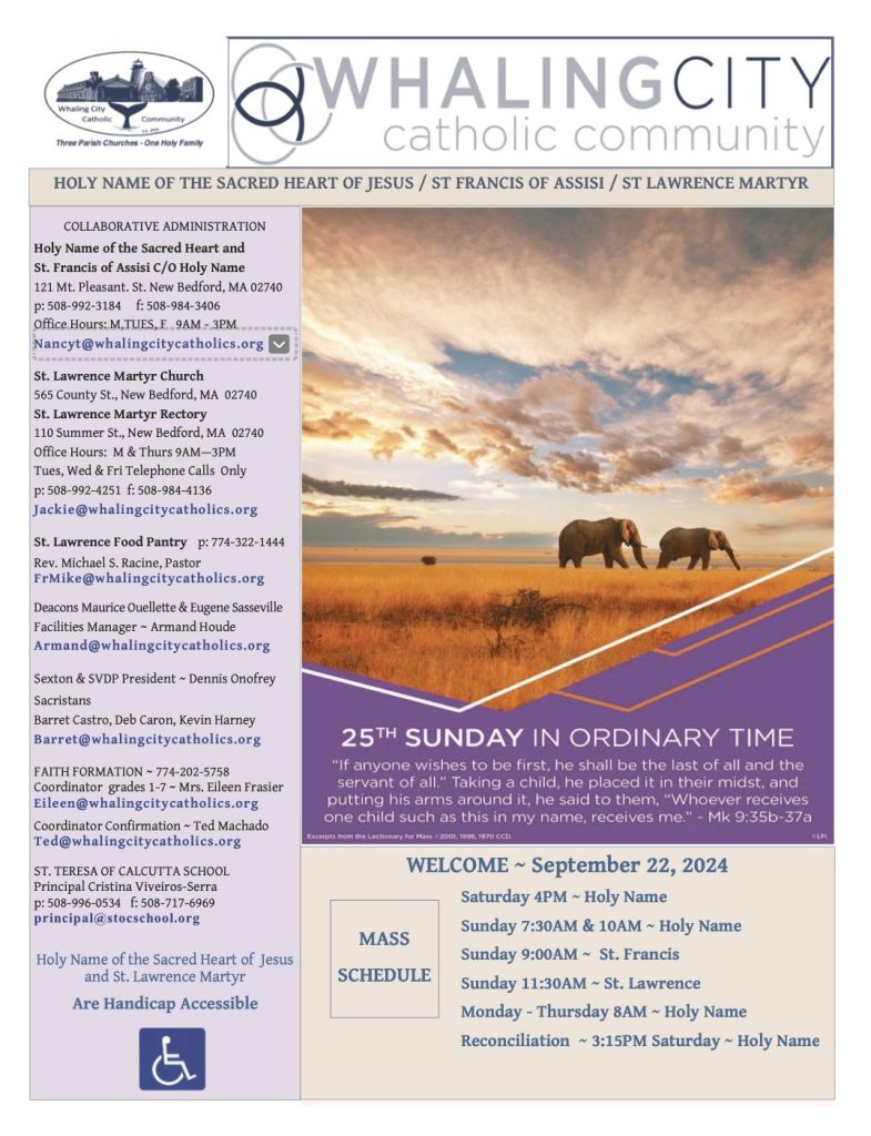 Bulletin for the 25th Sunday of Ordinary Time September 22, 2024 Sep 19, 2024 To view Bulletin select image above or this link.