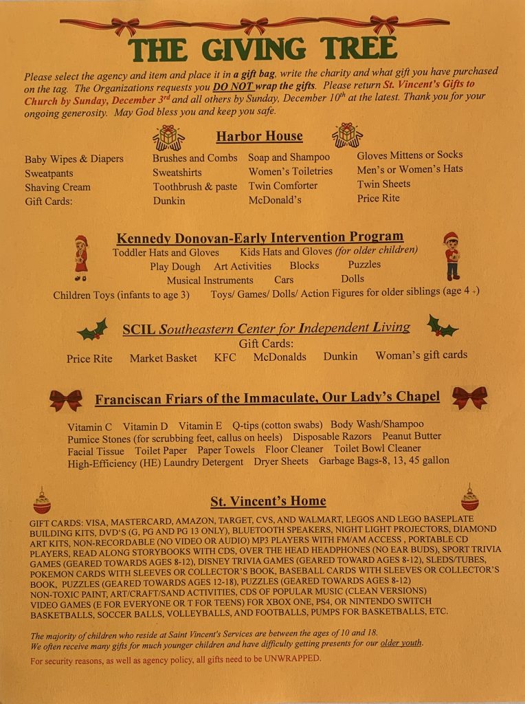 Please select the agency and item and place it in a gift bag, write the charity and what gift you have purchased on the tag. The Organizations requests you DO NOT wrap the gifts. Please return St. Vincent’s Gifts to Church by Sunday, December 3rd and all others by Sunday, December 10′ at the latest. Thank you for your ongoing generosity. May God bless you and keep you safe.